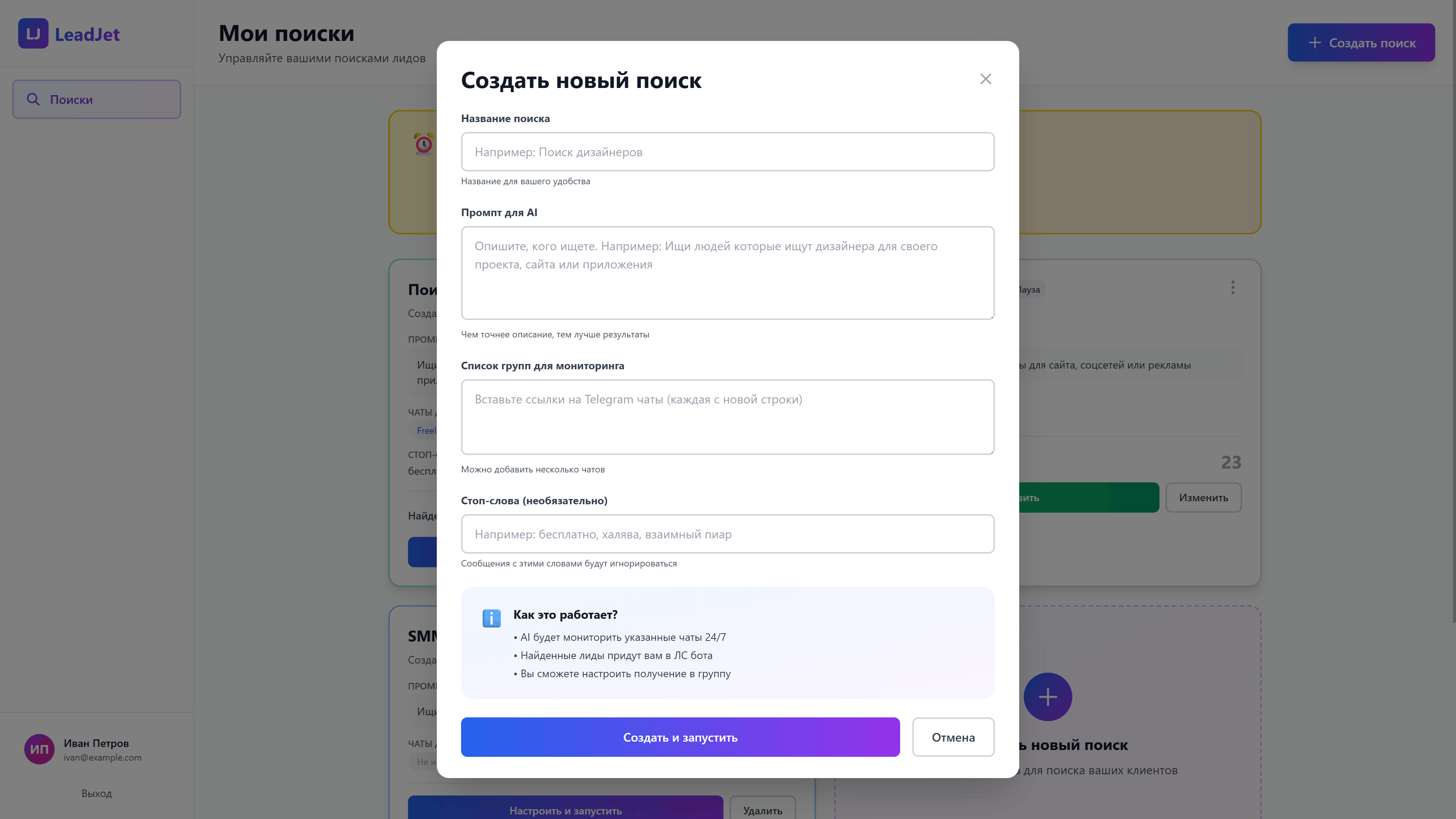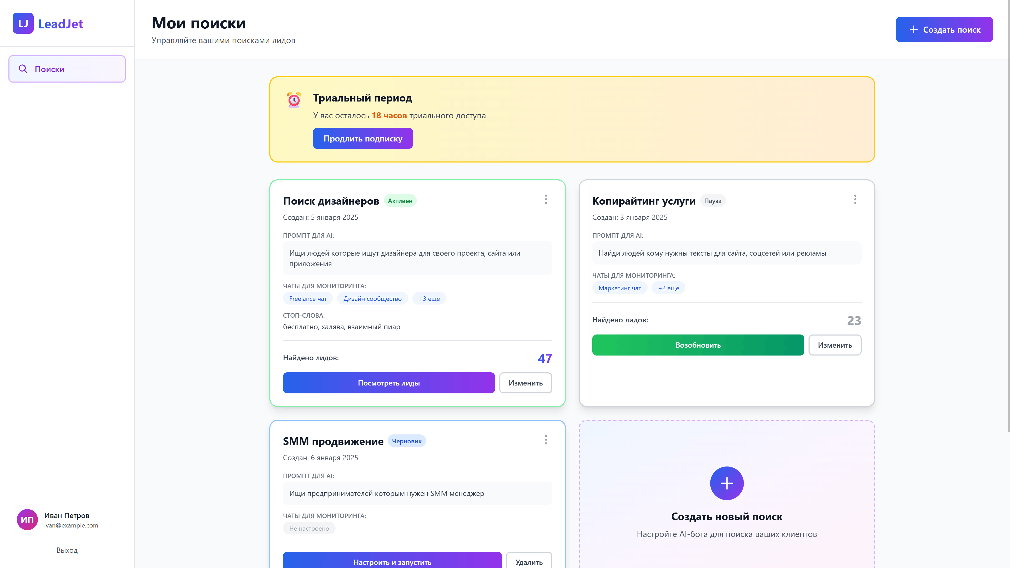 Это полный бесплатный доступ ко всем функциям сервиса на сутки. Вы сможете протестировать поиск лидов, настроить мониторинг чатов и оценить качество работы AI.